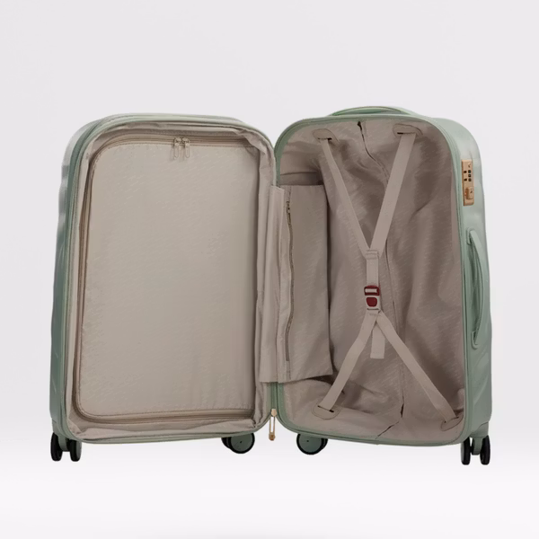 以全箱體薄荷綠為基調,搭配同色系飾件與溫潤金屬光澤。